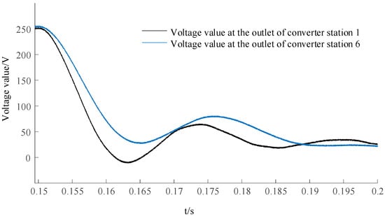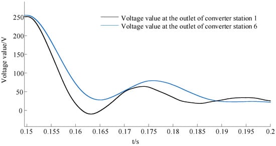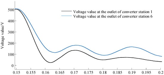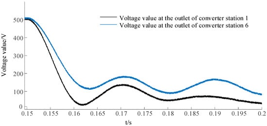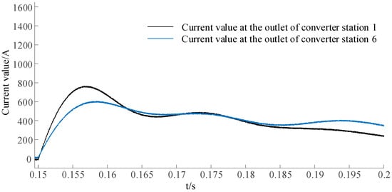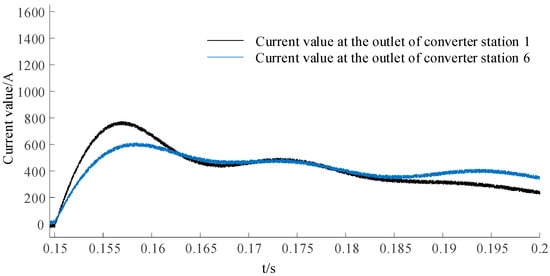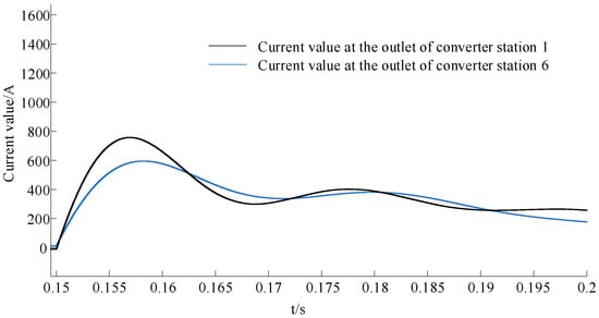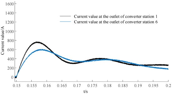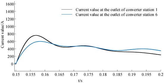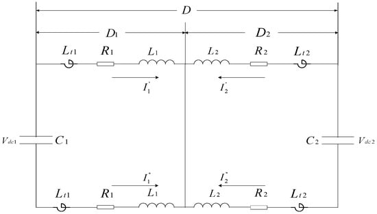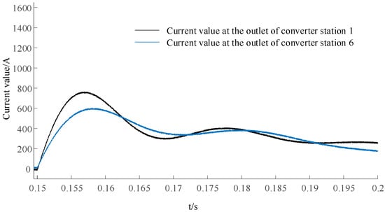 Due to the very small transient resistance in the inter-pole short-circuit fault, it can be neglected. In Figure 4, the limiting reactor on the positive-pole line is denoted , the current at the outlet of the left commutation station is denoted and the current values at the outlets of the right commutation station are denoted , and .