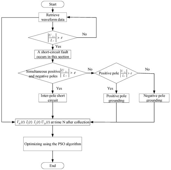 Flow chart of fault location in a multi-terminal DC distribution network using the PSO algorithm.