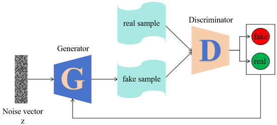 As shown in Figure 1, GAN consists of two components: the generator and the discriminator. The generator’s task is to generate samples that are as realistic as possible, while the discriminator’s task is to distinguish between the generated samples and real samples. During the training process, the generator and discriminator compete with each other, continuously optimizing their respective parameters until they reach a balanced state. The basic idea is to train the generator and discriminator through a competitive process, so the generator generates samples similar to real data. The loss function of the GAN is shown in Equation (1):