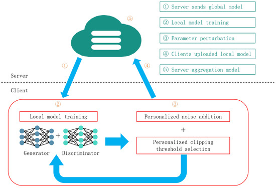 The process of a personalized privacy-preserving method based on GAN is shown in Figure 2. First, the server initializes the parameters for the generator, discriminator, and other components and sends them to each federated learning participant. Next, the federated learning participants locally train the GAN model by training the generator and discriminator separately. During the local training process, the participants personalize the noise scale and clipping threshold in differential privacy, ensuring that the trained generator model has differential privacy protection. Finally, the federated learning participants upload the trained local generator models to the server, which aggregates all the local models to obtain a final aggregated global generator model.