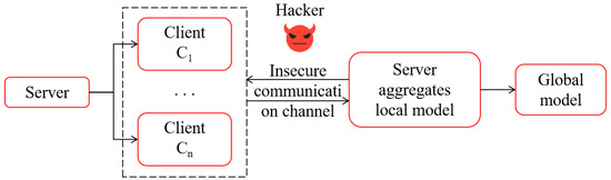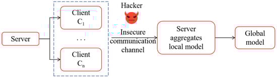 The traditional federated learning paradigm is illustrated in Figure 3. In this paradigm, clients’ local models are frequently transmitted over insecure communication channels, significantly increasing the risk of privacy breaches. Consequently, some studies have improved the traditional federated learning paradigm. Xin et al. modified the traditional federated learning paradigm by adopting a serial federated learning approach to train GAN models. In this approach, each client trains the global model sequentially, reducing the number of times that training data is accessed [29]. Zhang et al. found that the traditional federated learning paradigm requires extensive communication interactions, leading to significant communication overhead and increasing the model’s vulnerability to malicious attacks [41].