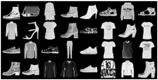 FashionMNIST: The FashionMNIST dataset consists of 70,000 images representing 10 different fashion items. This dataset includes 60,000 training images with labels and 10,000 test images with labels. Each image in the dataset is 28 × 28 pixels, showcasing various clothing items. Figure 6 shows some real data from the FashionMNIST dataset.
