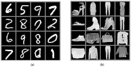 Fake images of MNIST and FashionMNIST. (a) MNIST fake images; (b) FashionMNIST fake images.