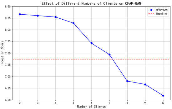 Subsequently, this study tested the impact of different numbers of clients on OFPP-GAN, with experimental data shown in Figure 8. From this figure, it can be observed that as the number of clients decreases, the IS value of the synthetic images generated by the generator increases, indicating that the synthetic images are closer to the original dataset, and the performance of the trained generator model is higher. Therefore, it can be inferred that this scheme is more suitable for scenarios with fewer federated learning participants; the fewer federated learning participants, the higher the quality of the generator model trained using OFPP-GAN.
