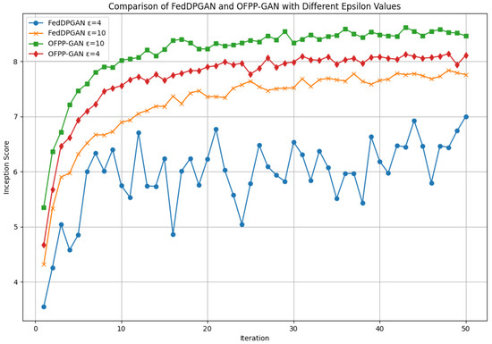 FedDPGAN: The FedDPGAN comparison algorithm applies the DPGAN scheme in a federated learning scenario. Federated learning effectively mitigates the “data island” problem in traditional training and significantly enhances the performance of the trained model. The results of this algorithm can demonstrate the advantages of OFPP-GAN in federated learning scenarios.