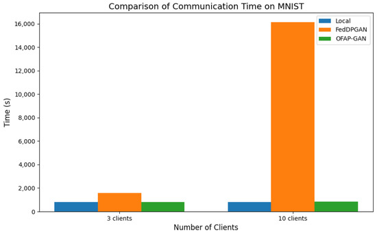 From the results, it can be observed that although the proposed OFPP-GAN scheme incurs higher communication overhead compared to local training, it significantly reduces communication costs compared to traditional federated learning schemes. This reduction can be attributed to the extensive communication overhead typically involved in server–client interactions in traditional federated learning settings. The one-time federated learning method alleviates this issue by reducing communication losses associated with multiple interactions. Additionally, the proposed scheme shows minimal variation in local computation overhead. This is because traditional federated learning schemes require 50 rounds of interaction with local training, while OFPP-GAN only requires one round of interaction with 50 rounds of local training. Overall, the computational overhead of these two methods is comparable throughout the process. Furthermore, by reducing communication overhead and minimizing client–server interactions, OFPP-GAN reduces the likelihood of system vulnerabilities to malicious attacks during communication, thereby enhancing privacy protection.