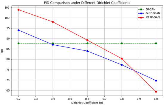 Finally, we tested the performance of OFPP-GAN under various data heterogeneity scenarios in federated learning, using different Dirichlet coefficients (). The experimental results are shown in Figure 11. The results indicate that as the Dirichlet coefficient increases, representing decreasing data heterogeneity, the FID (Frechet Inception Distance) values for all models generally improve, with a lower FID indicating better performance. Specifically, FedDPGAN demonstrates a more consistent performance across different heterogeneity levels, with a steadier decrease in FID as increases. While OFPP-GAN outperforms FedDPGAN and DPGAN in more homogeneous data scenarios (higher ), it struggles with higher FID values in more heterogeneous settings (lower ), indicating a sensitivity to data heterogeneity. OFPP-GAN shows a significant drop in FID as increases, demonstrating improved generative quality in less heterogeneous data settings.
