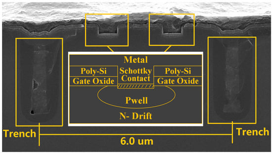 The Scanning Electron Microscope (SEM) cross-section of the fabricated DOT-SSBR is illustrated in Figure 1. Compared with the conventional SSBR, the deep isolated MOS trenches (DOTs) are formed in the epitaxial n-drift layer for DOT-SSBR, and there are two cells of Schottky contact super barrier (SSB) are formed on the mesa between two adjacent DOTs. The key design parameters used in manufacturing are shown in Table 1.