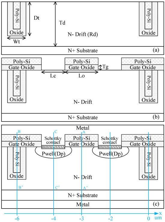 Compared to conventional SSBR, the proposed DOT-SSBR features the deep isolated MOS trenches (DOTs) in an epitaxial n-drift layer. As the floating heavily doped Poly-Si is an equipotential body wrapped by the oxide layer, similar to the mechanism of pinching-off electric field in TMBS [], the role of DOTs in DOT-SSBR is also to introduce the effect of pinching-off electric field, which introduces the peak electric field inside the n-drift layer under reverse bias. It will not only change the mesa surface electric field, but also change the average of electric field in n-drift layer.