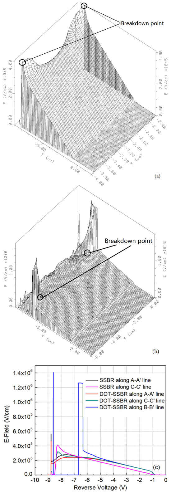 Simulated electric field at breakdown point of (a) SSBR, (b) DOT-SSBR, (c) SSBR along A-A’ line and C-C’ line (along X = −3 μm line and X = −4 μm line, shown in both Figure 2c and Figure 3a), and DOT-SSBR along A-A’ line, C-C’ line and B-B’ line (along X = −3 μm line and X = −4 μm line and X = −6 μm line, shown in both Figure 2c and Figure 3b).