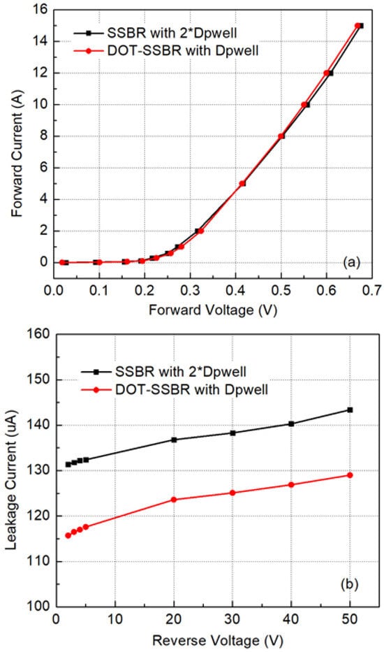 Figure 4 shows the measured forward and reverse I-V curves of the DOT-SSBR and SSBR. Each curve is formed by connecting several typical data points that are sufficient to describe the IV characteristics of the devices, and the value of each typical data point is the average of the samples on a 6-inch wafer. In addition to the deep isolated MOS trenches, the difference between DOT-SSBR and SSBR in the process conditions is the value of the Pwell implantation dose (Dp), and the value of Dp of SSBR is twice that of DOT-SSBR. A smaller value of Dp corresponds to a smaller super barrier and a smaller forward voltage to offset the increase in on-resistance caused by the decrease in effective active area after the introduction of DOTs. Therefore, as shown in Figure 4a, DOT-SSBR has almost the same forward I-V curve as that of SSBR. Thanks to the reduction in the mesa surface electric field caused by the pinching-off electric field effect of DOTs, DOT-SSBR has a smaller leakage current even though it has a smaller Dp (in the case of SSBR, small Dp leads to large leakage []), as shown in Figure 4b.