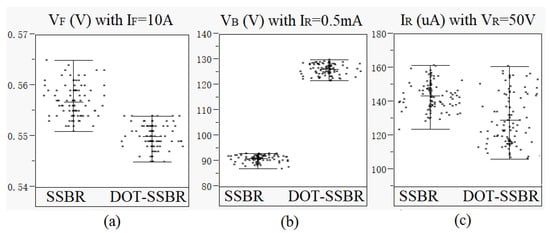 Distribution of scattered data points for (a) forward voltage, (b) breakdown voltage and (c) reverse leakage current from 6-inch wafer samples for DOT-SSBR and SSBR.