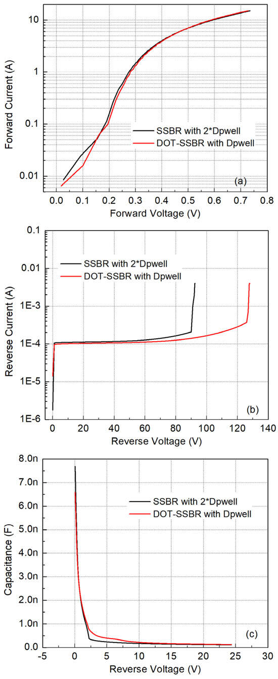 Measured (a) forward, (b) reverse and (c) C-V characteristics of packaged DOT-SSBR and SSBR.