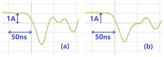 Figure 7 shows the measured forward, reverse and C-V characteristics of the packaged DOT-SSBR and SSBR. As seen from Figure 7c, DOT-SSBR has a slightly larger capacitance as that of SSBR. Figure 8 shows the measured reverse recovery current of the packaged DOT-SSBR and SSBR. It is obvious that the proposed DOT-SSBR shows a slightly larger reverse current amplitude and could show higher reverse recovery charges than that of the conventional SSBR, which shows a trend consistent with the results in the C-V curves in Figure 7c (i.e., higher parasitic capacitances and hence higher charges). However, as unipolar conduction devices, both of the SSBR and DOT-SSBR have fast reverse recovery characteristics. The measured reverse recovery times are both approximately 37 ns.