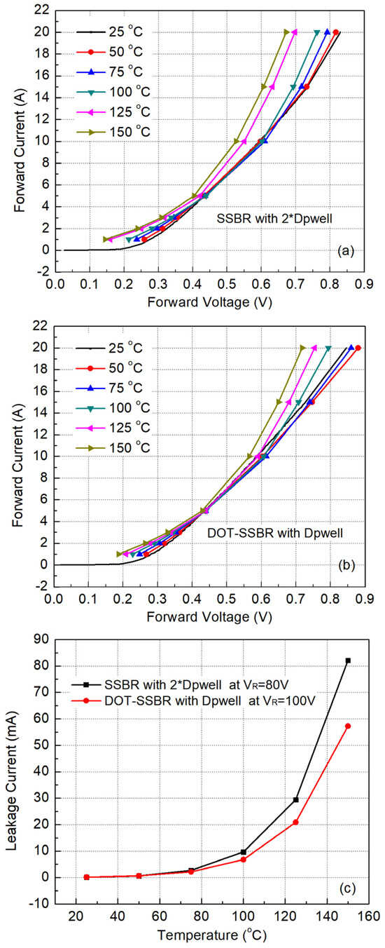 Measured high-temperature characteristics of (a) forward I-V curves for packaged SSBR, (b) forward I-V curves for packaged DOT-SSBR and (c) reverse leakage current for packaged DOT-SSBR and SSBR.