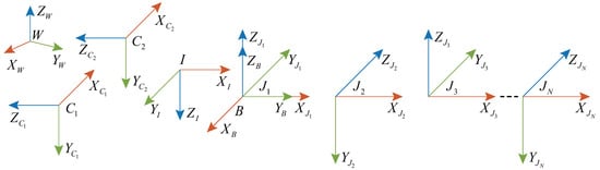 In Figure 1, the cameras and the inertial measurement unit (IMU) are fixed on the head of the snake robot, and the frames of each camera are and . The IMU frame is I. The frames of the base linkage and each joint linkage are B, , , , …, . The transformations from B to , B to , and B to I are , , and , respectively, which are obtained through calibration. The transformations from B to , to , ⋯, to are , , ⋯, , respectively, which are obtained through the kinematic model.