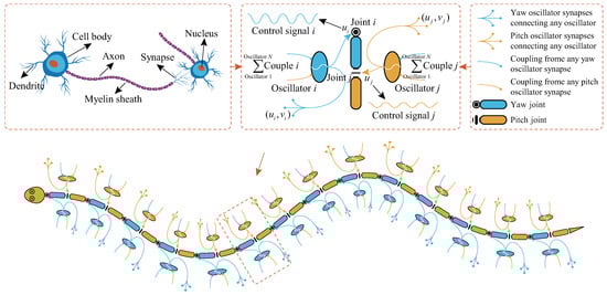 Due to the self-excited oscillation characteristics of the CPG model, which can spontaneously and continuously generate rhythmic signals, we can use these signals as joint-control signals for snake robots to achieve their body rhythm wave and drive their movement, as shown in Figure 3. In our previous research, we proposed an improved Hopf oscillator and its coupling model for the CPG model to achieve motion control of the snake robot [45]. The improved Hopf oscillator of the CPG model is