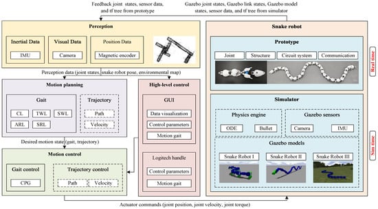 Inspired by the work of Sanfilippo [39], SnakeSys is divided into five modules: snake robot, perception, motion planning, motion control, and high-level control in the control architecture, as shown in Figure 5. The snake robot module includes two sub-modules: the simulator module and the prototype module.