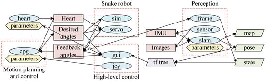 We construct the SnakeSys (accessed on 31 December 2023) software based on ROS infrastructure. The different modules and communication data among modules in the control architecture correspond to multiple nodes and topics of the ROS, as shown in Figure 6. We strive to utilize existing open-source libraries such as Qt, VTK, GSL, OpenCV, etc., for software construction to ensure that SnakeSys is easy to expand or further develop. Different hardware requires corresponding drivers, but as long as its data format is consistent with that of SnakeSys or the ROS, it is easy to integrate new hardware into SnakeSys.