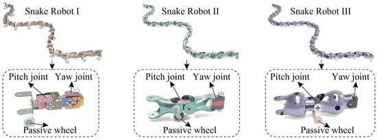 Orthogonal joints corresponding to Snake Robot I, Snake Robot II, and Snake Robot III.