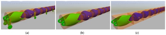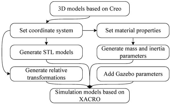 We designed three joint models for snake robots with different structures and sizes through Creo: Snake Robot I, Snake Robot II, and Snake Robot III. The orthogonal joint structures are shown in Figure 7, and the design parameters are shown in Table 2. Each type of snake robot model corresponds to two situations: with and without passive wheels. The steps from the 3D model to the XACRO model are shown in Figure 8. We set the coordinate system and material properties in Creo and then export STL models, transformations among coordinate systems, and the inertia tensor parameters to establish the XACRO models for the snake robots. This paper establishes XACRO models for six types of snake robots, whereby three types with passive wheels are used for CL gait and the other three without passive wheels are used for complex three-dimensional motion gaits.