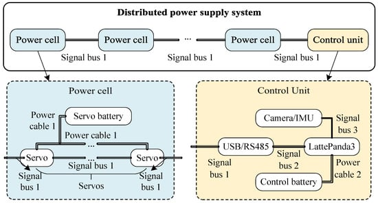 To solve the power supply problem of motors, we designed a distributed power supply system for the snake robot, which is composed of multiple power cells, as shown in Figure 10. Each power cell consists of even motors and a rechargeable lithium battery, and the battery supplies power to these motors simultaneously. These motors are connected in series through power cables and signal buses in a power cell. A snake robot includes a control unit and multiple power cells in series and only a signal bus connection among them. This distributed power supply system can make the snake robot get rid of the power cord of the online power supply, realize flexible offline movement, and greatly improve its endurance.