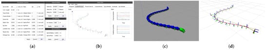 The GUI module of SnakeSys. (a) Parameter control of the GUI module. (b) Data visualization of the GUI module. (c) The state of the snake robot in Gazebo. (d) Visualization of in RViz.