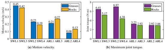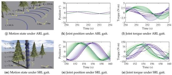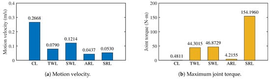 Due to the coupling gain coefficient and attraction factor affecting the synchronization speed and waveform change rate of the CPG model, we set and through empirical methods to ensure that the CPG model has a good synchronization speed and smooth waveform change state. The bifurcation parameter affects the convergence state of the oscillator, and setting ensures that the amplitude parameter of the oscillator is consistent with the waveform amplitude. The simulation parameters corresponding to five motion gaits are shown in Table 3. Among them, the sign of the frequency only affects the direction of movement. For example, for TWL gait, negative frequency makes the snake robot move forward, while positive frequency makes it move backward. The cylinder collision model is used for CL, SWL, and ARL gaits, while the box collision model is used for TWL and SRL gaits. Using SnakeSys for simulation, the results are shown in Figure 13. The histograms of motion velocity and maximum joint torque corresponding to the five gaits are shown in Figure 14. To avoid the influence of on motion velocity, the velocity value in Figure 14a is equal to the velocity at .