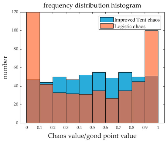 This paper delves into a comparative analysis between the traditional Logistic mapping and the refined Tent mapping in the context of chaotic mapping. The construction of the initial population is demonstrated under the premise of a population size of 500 and a dimensionality of 1, with values spanning the range from 0 to 1. The comparative assessment, as depicted in Figure 2, indicates that the Improved Tent chaotic mapping manifests a more uniform distribution and superior uniformity in comparison to the Logistic mapping, where the orange bars represent the logistic population distribution and the blue bars represent the tent population distribution. The mathematical expression for the Tent mapping is as follows: