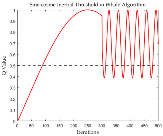 The sine–cosine inertial threshold of Q is pivotal as it empowers the algorithm to navigate away from local optima while steering towards the global optimum. By intelligently modulating the search behavior based on the stage of the algorithm, this approach imbues the WOA with a robust framework that harmonizes exploration and exploitation, ultimately refining the convergence characteristics toward the optimal solution.