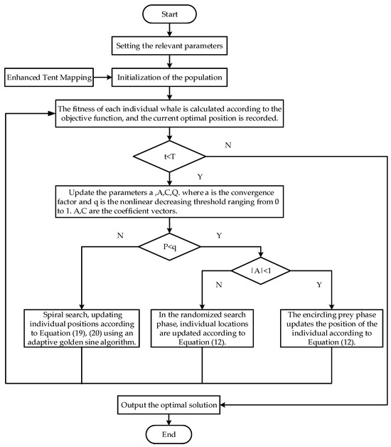 The flowchart of the IWOA algorithm is shown in Figure 6.