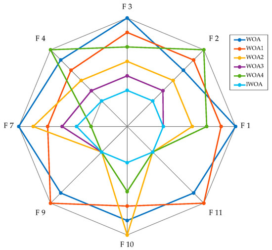 To visualize the mean rankings of the five improvement strategies, a radar plot is drawn (Figure 7), with IWOA represented in blue. The smallest enclosed area in the plot indicates IWOA’s superior overall performance, followed in descending order by WOA3, WOA2, WOA4, WOA1, and WOA.