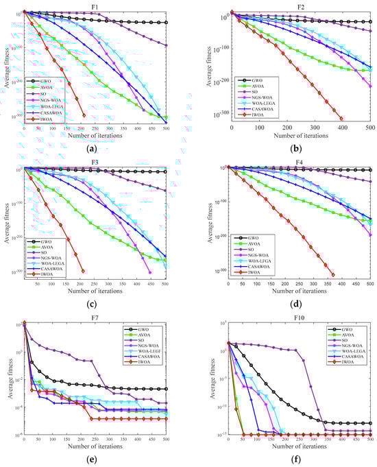Based on the data in Table 4, the convergence curves of IWOA and various improvement strategies are depicted in Figure 8a–f. These curves reflect the convergence speed, accuracy, stability of the algorithm, and its ability to escape local optima.