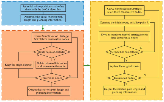 Improved Initialization and Optimization: Addressing the issue of maladaptive initialization in the standard Whale Optimization Algorithm (WOA) for path planning, the proposed Improved Whale Optimization Algorithm (IWOA) incorporates a population initialization method based on an enhanced Tent Chaos Theory. This method significantly improves the quality of initial solutions. To tackle the inefficiency of the WOA’s optimization search, the paper introduces differentiated dynamic weights into the search strategy, which better balances convergence performance during the early and late stages of exploration and development. Additionally, an Adaptive Golden Sine Algorithm is proposed for the position update phase, greatly enhancing the convergence speed and local search capability of the algorithm.