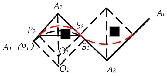 In this study, the Golden Sine Algorithm (GSA) [26] is adeptly utilized for spiral position perturbation, offering a more efficient reduction of the search space compared to conventional optimization algorithms. The GSA updates the whale’s position in a quadratic manner, which is designed to expedite the convergence process, where the red line represents the image of the sine function and the black line is the search space for the golden sine function. The location update strategy is shown in Figure 5.
