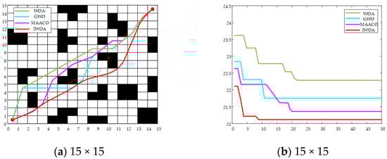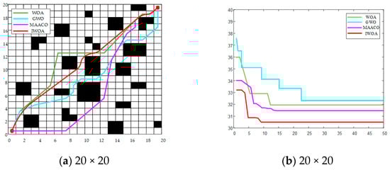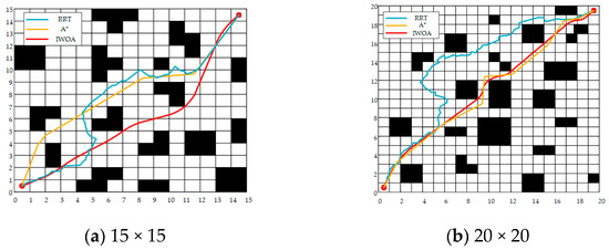 - Simulation experiments and performance comparison: Comparative analyses of simulation results across various map environments, generated using the raster method, indicate that the IWOA algorithm shows enhanced environmental adaptability compared to WOA, GWO, MAACO, RRT, and A*. On a 15 × 15 grid, the IWOA algorithm demonstrates performance improvements of 1.27% over the shortest-path MAACO algorithm and 12.59% over the smoothest-path optimal A* algorithm. On a 20 × 20 grid, IWOA achieves performance enhancements of 1.59% compared to A* and 23.94% compared to WOA optimized for smoothness.