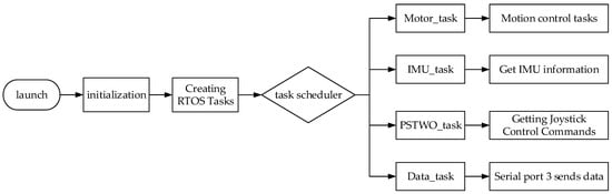 Given the STM32’s requirement to manage multiple sensor inputs and respond to control commands from the industrial control machine, achieving real-time performance with a traditional sequential structure is challenging. To overcome this, the FreeRTOS operating system is utilized, and four tasks are created: motion control task, IMU information acquisition task, handle control task, and ROS control task. The program structure is illustrated in Figure 21.