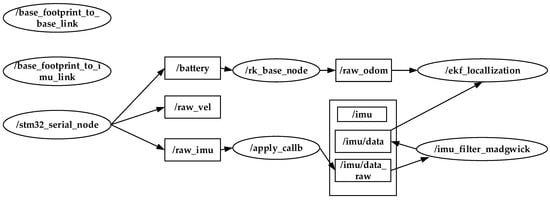 In this diagram, ellipses represent node names, and boxes denote topics that facilitate communication between nodes. To enable communication between the ROS system and STM32, the /stm32_serial_node communication framework is utilized. Given that the IMU, odometer, and mobile platforms operate within different coordinate systems, it is essential to first establish their spatial relationships and create a unified reference frame using the TF coordinate transformation method for subsequent data fusion and positioning calculations. The Figure shows /base_footprint_to_base_link and /base_footprint_to_imu_link. The /raw_odom topic represents odometer data, which can be displayed using the rostopic echo command in the ROS system.