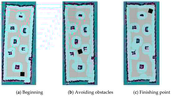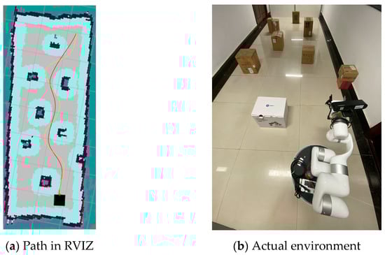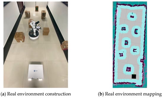 Initially, a personal computer (PC) connects to the Wi-Fi signal emitted by the mobile robot. Upon successful communication, the relevant software package is executed to construct a map of the environment using Light Detection and Ranging (LiDAR) technology and to perform navigation experiments. Figure 23b illustrates the generated map, where the dark red areas represent obstacles, and the black square denotes the robot’s position. The corresponding real-world scene is depicted in Figure 23.
