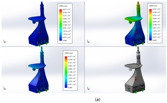 Simulations of the Shadow robot built with PLA are presented. From left to right and top to bottom, the tests include the robot under its own weight in gravity, with an additional weight of 40 kgf on the tray, with a weight of 10 kgf on the tray, and the model. (a) Simulation of the static Shadow displacement. Scale: to 0 mm. (b) Simulation of static unitary Shadow deformation. Scale: to equivalent strain.