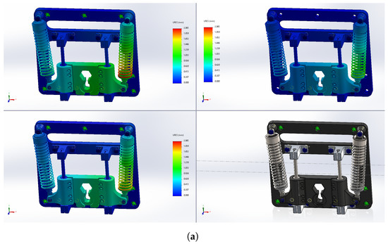 Simulations of the damping system under a vertical force of 60 kgf on the wheel axle combined with a torque of 10 Nm are presented. The results are organized from left to right and top to bottom, showing tests with TPU HARDNESS+, PLA, ABS, and the model. (a) Simulation of the static damping system displacement. Scale: to 0 mm. (b) Simulation of static unitary damping system deformation. Scale: to 0 equivalent strain.