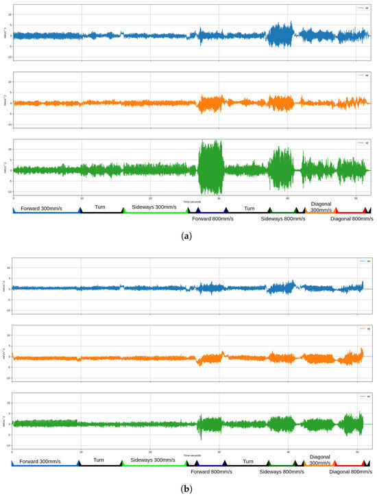 The performance of Shadow’s suspension system was validated through a series of rigorous tests designed to assess its effectiveness in reducing vibrations. A three-axis accelerometer was placed on the chassis with a sampling rate of 4 ms, and the robot was driven through several forward, lateral, diagonal, and rotational movements at 800 mm/s and 300 mm/s. Table 3 shows the movements’ sequence and speeds.