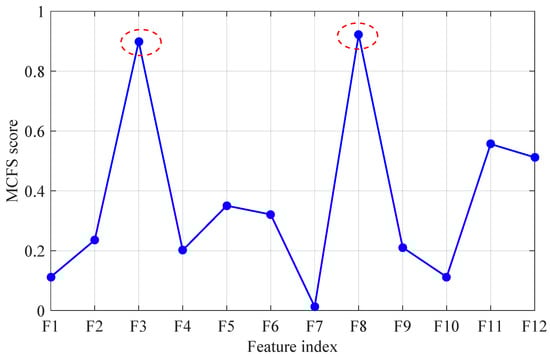 A total of twelve feature indexes (i.e., ) are calculated from each load sequence for each power user, as listed in Table 1. After that, the MCFS algorithm is employed to perform feature selection for them. Regarding the parameter setting for MCFS, ‘0–1’ weighting in Equation (4) is adopted because of its simplicity and the neighbor count is configured to be 5. Empirically, the cluster number C is set to be 5. The twelve MCFS scores for these features are plotted in Figure 2, where it is noted that these values are normalized into the range [0, 1]. From Figure 2, it is clear that the MCFS scores of different features are different, while the scores of F3 and F8 are obviously higher than those of other features. This means that F3 and F8 contain the important information of the whole feature set, and hence both F3 and F8 are selected and determined as the salient and sensitive features, and the rest of the features are simply discarded.