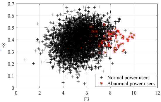We treat the values of F3 and F8 as the horizontal coordinate and vertical coordinate, respectively, so the load sequence of all users can be mapped as scatter points on a two-dimensional plane, as shown in Figure 3. In this figure, each dot represents a user, with the black dot representing a normal power user and the red dot representing an abnormal power user. It is clear to see that most of the points corresponding to abnormal users are distributed in areas with low density. The core idea of the unsupervised anomaly detection method based on GMM is to give each user the anomaly degree according to the local density.