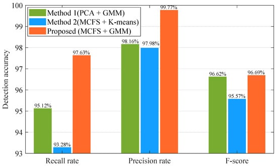 In order to further verify the effectiveness of the proposed approach, two other methods are combined to make comparisons with the proposed method, as graphically displayed in Figure 4. In Method 1, PCA replaces MCFS to perform feature selection, while GMM is still used for anomaly detection. In Method 2, the K-means algorithm replaces GMM to perform anomaly detection, while MCFS remains to conduct feature selection. The performance indicators for the recall rate, the precision rate, and F-score are compared for the three methods.