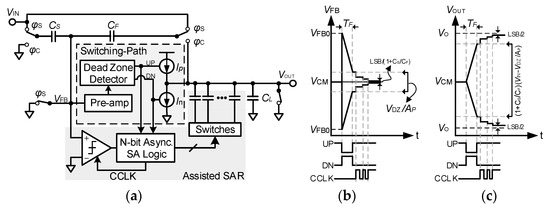 In Figure 2, implementation of the embedded assisted SAR path is shown, which consists of a comparator, an asynchronous SAR logic (clock generation loop and SAR logic), and a CDAC. By finalizing the coarse amplification (described in Section 3.1) and reducing the VFB in the dead-zone region, VDZ, the switching path’s current sources are deactivated (state II in Equation (7)) (Figure 2c) and the clock generation loop of the asynchronous SAR logic is enabled, i.e., the EN signal becomes high. The clock signals for the comparator (CCLK) and SAR logic (R) are generated by the clock generation loop of the asynchronous SAR logic. The CCLK is fed to the comparator to perform the quantization and generate the CP signal. Depending on the CP signal, in each cycle of the clock signal R, the statuses of CDAC switches (S1, S2, …, SN) are defined by the D-flip flop (D-FF) outputs, i.e., either connected to VREFH or VREFL. Then, CDAC provides the binary step voltage at the output node, which reduces the settling error to VLSB through the rest of the amplification period, Figure 2b,c.