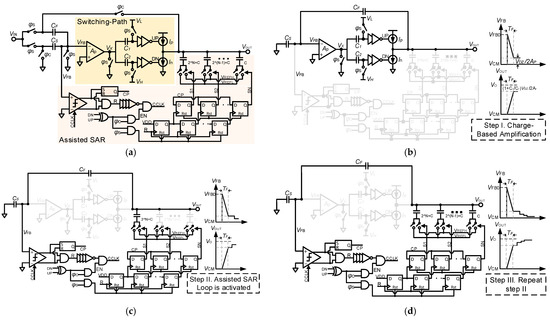 (a) Proposed PPH-based SC amplifier. (b) Coarse amplification with switching path. (c,d) Steps of fine amplification by SAR-assisted path.