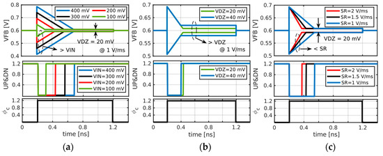 Waveforms of VFB, UP and DN control signals, and conversion phase’s clock when the switching path is operating for different: (a) VIN, (b) VDZ, and (c) slewing rates.