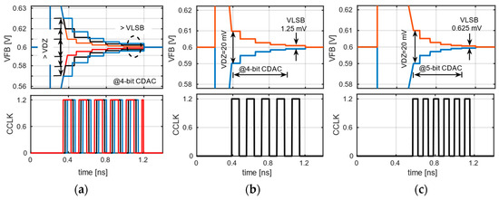 The performance of the assisted SAR path is explored in Figure 4, by illustrating the VFB error and CCLK signals for different VDZ and CDAC’s number of bits. Figure 4a shows the VFB error for different VDZ with a 4-bit CDAC and a 1.5 V/ms slew rate, where VDZ defines the errors left for the assisted SAR path, larger VDZ results in a larger error being left in a fixed 4-bit CDAC, i.e., VDZ/24. Figure 4b,c show the VFB error for VDZ = 20 mV and a 1.5 V/ms slew rate, and two different CDAC’s number of bits, 4 and 5 bits, respectively. As is shown, adding an extra bit yields a half VLSB, from 1.25 mV to 0.625 mV, while an extra SAR cycle is needed due to an additional bit. In addition, since CCDAC is doubled, the coarse amplification takes around ×2 more time.