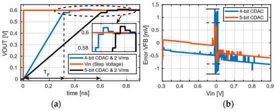 Figure 5a shows the step response of the PPH amplifier with a 2 V/ms slew rate for 4-bit and 5-bit CDACs. For the amplification time of 1 ns, in the case of a 4-bit CDAC, it takes 0.3 ns to reach the dead-zone voltage of 20 mV, while it takes almost double that in a 5-bit CDAC, around 0.6 ns. Then, the assisted SAR starts to perform with 4 and 5 step voltages and reduces the error to around 1 mV and 0.5 mV, respectively. The VFB error versus the input voltage for 4-bit and 5-bit CDACs is shown in Figure 5b, where the error is kept to less than 1.25 mV and 0.625 mV for a range of input voltages between 300 mV and 900 mV.